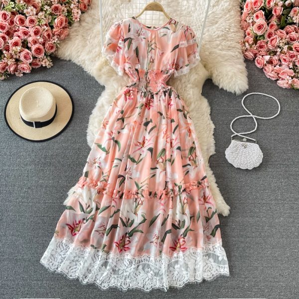 Bohemian Women Floral Printed Dress Summer Vacation Beach Midi Vestidos Elegant Female Flower A-Line High Waist Robe New