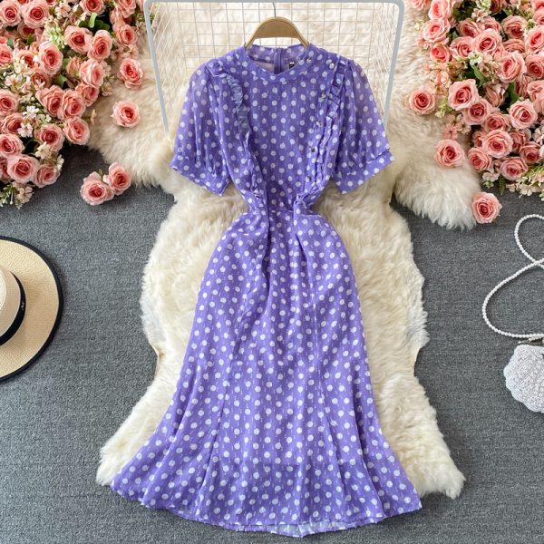 Casual Purple/Blue Polka Dot Midi Dress Women Vintage Stand Collar Short Sleeve Chiffon Vestidos Female Summer Elegant Robe