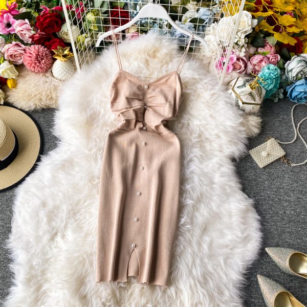 Elegant V-neck Spaghetti Strap Women’s Sexy Dress Summer Beige/Yellow High Waist Beading Bodycon Dress For Female Vestidos
