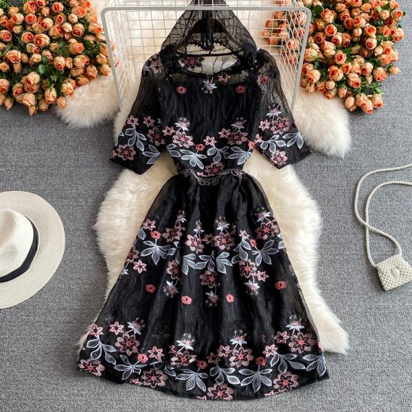 Black Embroidered Lace Dress Women Vintage Hooded High Waist A-Line Slim Hollow Out Vestidos Female Elegant Robe Summer New