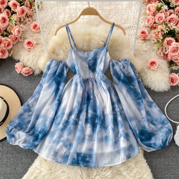 Women Beach Dye Tie Mini Dress Sexy Slash Neck Spaghetti Strap Off Shoulder Vacation Party Vestidos Ladies Long Sleeve Robe