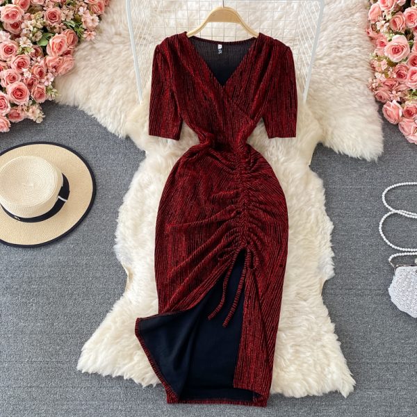 Sexy Drawstring Bodycon Dress Women Short Sleeve High Waist Red/Green/Khaki Sheath Party Vestidos Summer High End Fashion