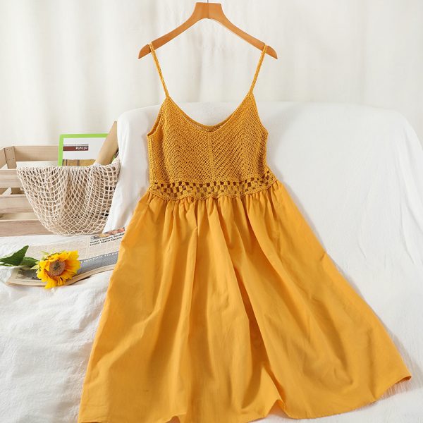 Summer Sexy Hollow Out Spaghetti Strap Dress Women Yellow/White/Beige/Black A-Line Patchwork Camisole Vestidos Ladies New