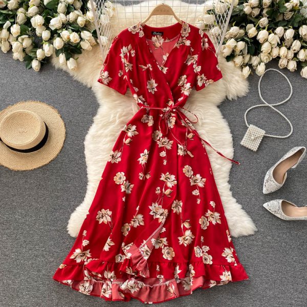 Vintage V-Neck Ruffle Printed Midi Dress For Women Summer Casual Short Sleeve High Waist Slim Red/Green/Pink Vestidos New