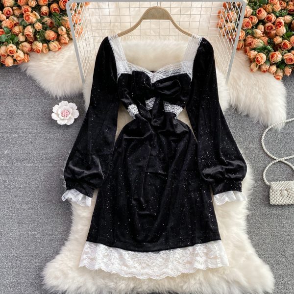 Vintage Black Lace Patchwork Velvet Mini Dress Sexy Square Collar Puff Long Sleeve High Waist Bow Party Vestidos Female Autumn
